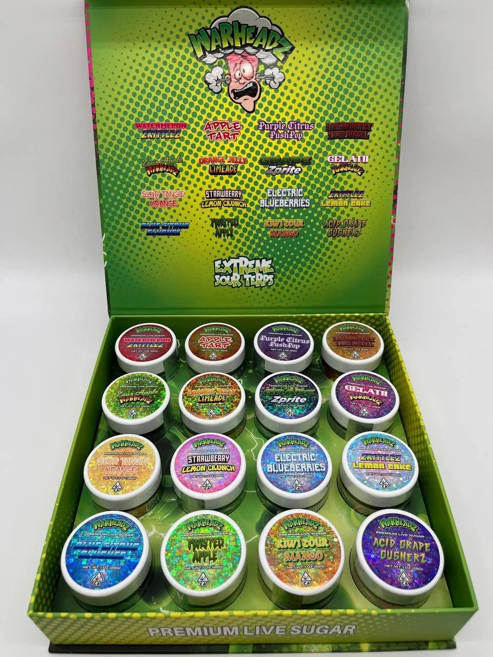 WATERMELON ZKITTLEZ, APPLE TARTZ, PURPLE CITRUS PUSH POP, STRAWBERRY SOUR DIESEL, ZOUR APPLE WARHEADZ, ORANGEL JELLY LIMEADE, GRAPE ZPRITE, GELATII WARHEADZ, SOUR TANGIE ORANGE, STRAWBERRY LEMON CRUNCH, ELECTRIC BLUEBERRIES, ZKITTLEZ LEMON CAKE, BLUE CITRUS SLUSHEE, TWISTED APPLE, KIWI ZOUR MANGO, ACID GRAPE GUSHERZ, OUNCE, QUARTER POUND, HALF POUND, POUND